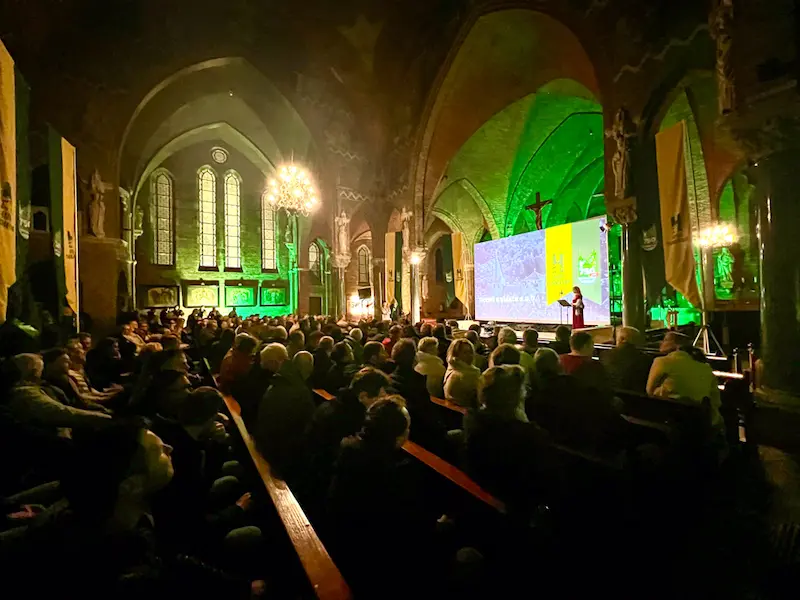Denekampse ondernemers ontvingen een speciale uitnodiging voor deze unieke avond. De bijeenkomst begon bij Skik, waar de gasten om 19.30 uur werden verwelkomd. Onder trompetgeschal liep het gezelschap vervolgens via een rode loper, geflankeerd door vuurkorven, naar de St. Nicolaaskerk. Binnen werden zij ontvangen in een prachtig aangeklede kerk, met grote groen-gele banieren van Denekamp 750 en Hugo. De avond werd ingetogen geopend met de prachtige zang van zangeres Ellen IJland.