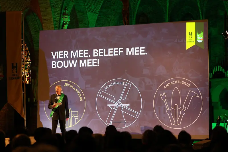 Namens de sponsorcommissie sprak Vincent Monninkhof de aanwezigen toe. Hij benadrukte het belang van de ondernemers voor het welslagen van zowel het jubileumjaar als het openluchtspektakel. ‘Dit alles kan alleen georganiseerd worden als er financiële middelen zijn. Maar sponsoren zijn niet alleen belangrijk vanwege hun bijdrage, maar ook vanwege de saamhorigheid die zij vertegenwoordigen. Uiteraard krijgen zij daar ook iets bijzonders voor terug. Als ondernemer ben je onderdeel van iets waar nog generaties over gepraat gaat worden.’ Monninkhof presenteerde drie sponsorgildes: het Nicolaasgilde, het Molengilde en het Ambachtgilde. De eerste toezeggingen kwamen diezelfde avond al binnen.