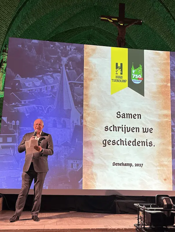Na een korte introductievideo nam Arjen Meinders, voorzitter van Denekamp 750 jaar, het woord. Gekleed als boer uit de viering van 700 jaar Denekamp in 1977 vertelde hij in het Twents over de vele vrijwilligers die al maandenlang werken aan de voorbereidingen. ‘Ruim 100 vrijwilligers zijn al bezig in verschillende commissies. Zij zorgen ervoor dat alle Denekampers, jong en oud, samen gaan genieten van dit feestjaar. Een jaar dat voorgoed in ons geheugen zal blijven en waar we allemaal trots op zullen zijn. En organiseren… dat kunnen we!’ aldus Meinders. Het motto van de avond: Samen maken we geschiedenis. Ook Tom Olde Dubbelink, voorzitter van Hugo van de Denekamp, nam het woord. Gekleed als heraut vertelde hij vol enthousiasme over het grootse theaterspektakel dat in 2027 opnieuw zal worden opgevoerd, ditmaal op het schitterende landgoed Singraven. ‘Het is niet zomaar een toneelstuk. Het is een gigantisch openluchtspektakel dat slechts drie keer eerder is opgevoerd: in 1931, 1947 en 2000. In 2027 doen we dat opnieuw, groter, mooier en op een unieke locatie.’